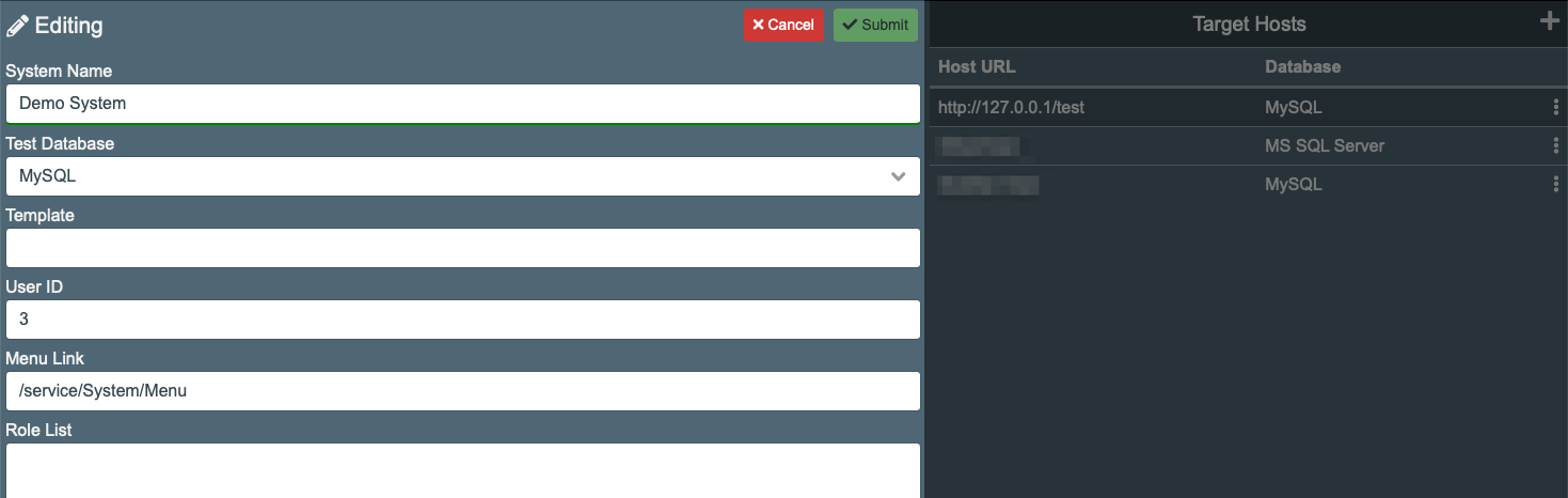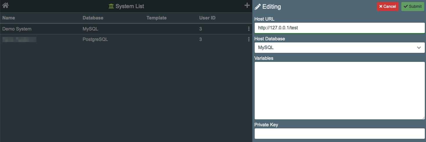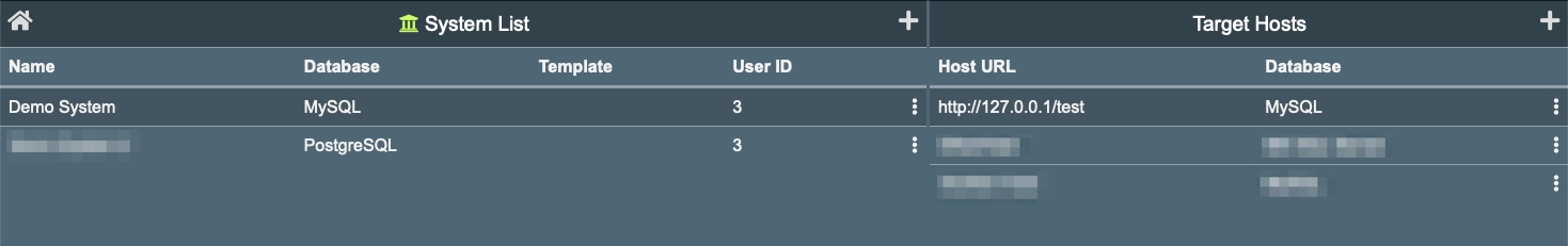 Clicking in the "+" button will open the system editor to add a new system, and clicking the three-dots icon in the extreme left of a row will to edit the information.