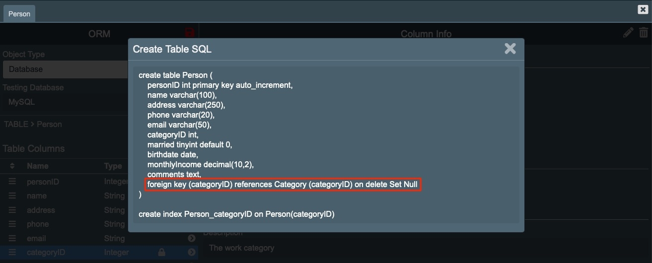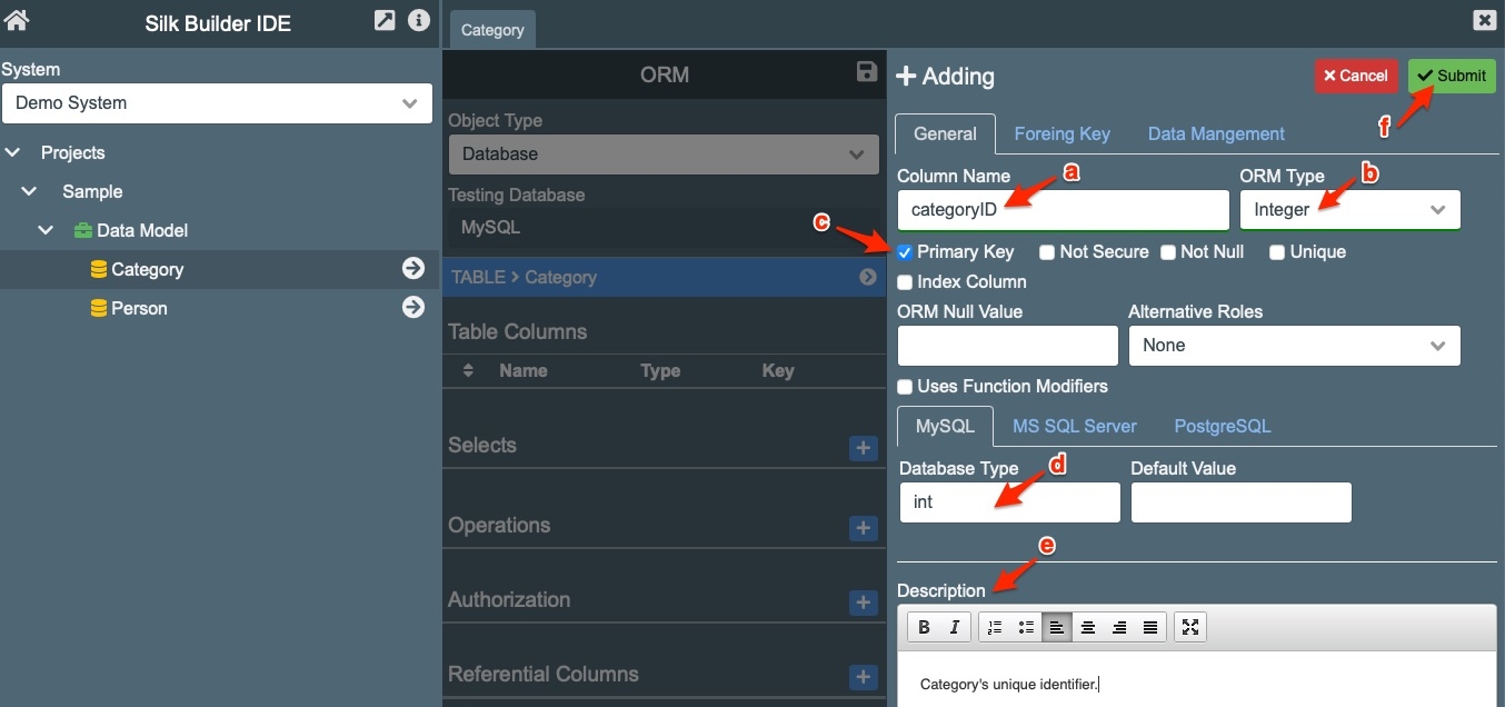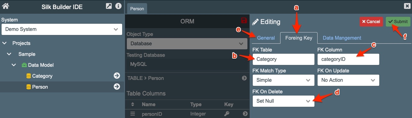 The extra step is to set the column "categoryID" as a "Foreign Key". For this process click on the "Foreign Key" tab (a) while editing the column. Enter the foreign key table (b) which is "Category" in our sample. Enter the foreign key column (c) which is "categoryID" in our case. There are fields to set the foreign key action. For this case the "FK on Delete" (d) is set to "Set Null". After this you could return to the "General" tab (e) to continue editing the column, or click on the "Submit" button (f) to save the information into the ORM structure.