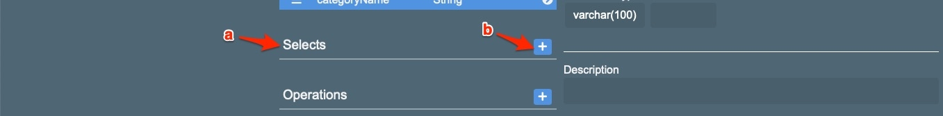 To define a "Select" locate the "Selects" (a) list and click on the plus button (b), this will open the Select Editor.