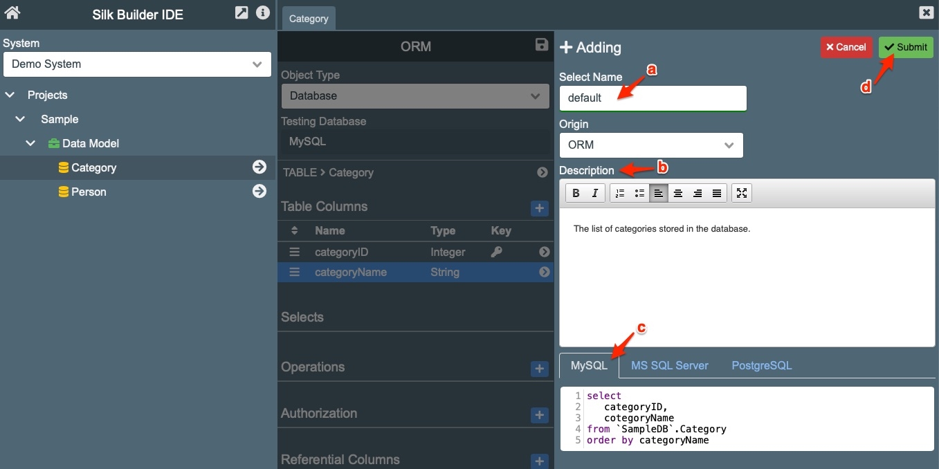 After creating the columns the "default" select has to be added. This is the SQL select code to be use in the sample. Add this following the same process used in the ORM for the table Category.