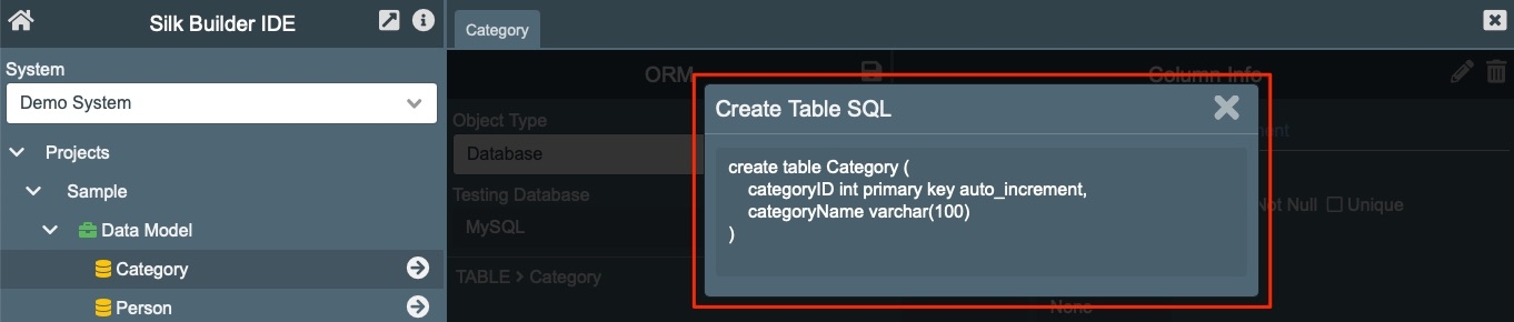 SQL : Generates the Create Table SQL command which can be used to create the table in the database.