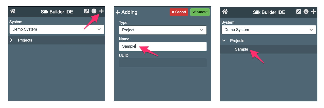 Projects are manage inside the Silk Builder IDE. To create on Project select the System being used, select the projects root element and click on the plus button located at the top right of the frame. Enter the project's name and click on the Submit button.