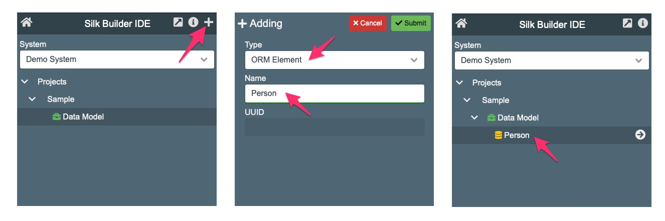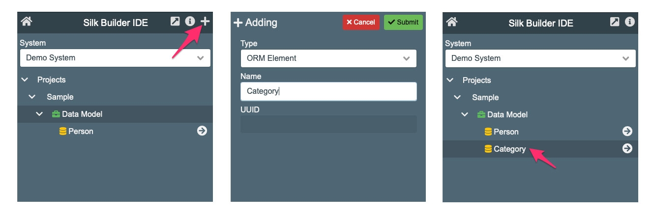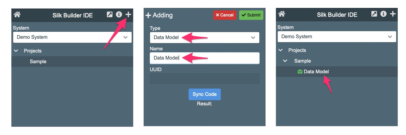 To create a Data Model select the Project, "Sample" in this case, and click on the plus button at the top right of the frame. For Type select "Data Model" and enter a name. This name helps to "categorize" the ORMs. For our sample we will use the name "Data Model" considering that this is a small project. After entering the name click on the Submit button and the Data Model element will be added.
