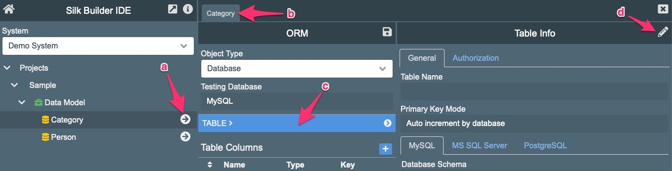 In the Table editor we configure the table which is going to received the ORM action. First you have to enter the "Table Name" as it is in the database (a). Then select the "Primary Key Mode" (b). For our sample this is set to "Auto increment by database". The other options are "SQL Query", "Value Provided", and "UUID auto generated". The next option is to enter the "Database Scheme" (c). This is use to properly locate the table in the database server.