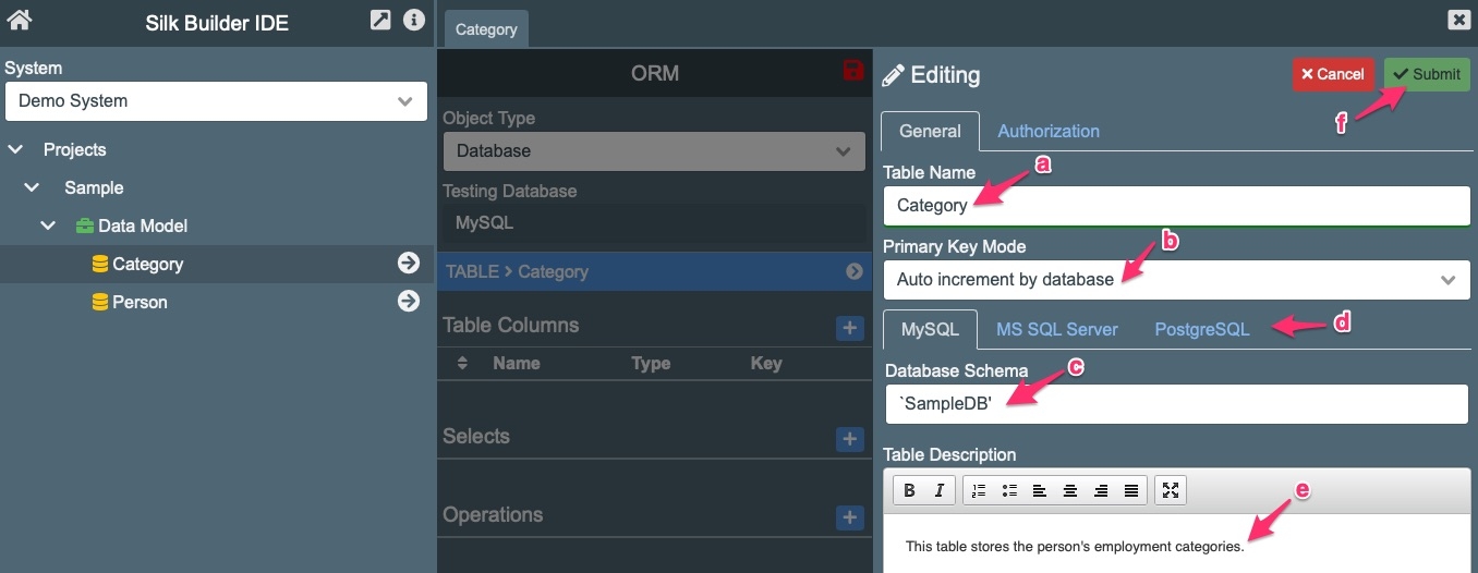 After the table's information has been entered click on the "Submit" button (f) to save this into the ORM structure.