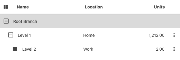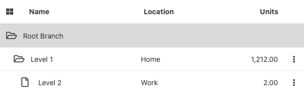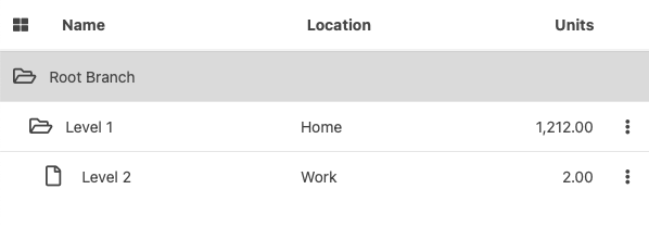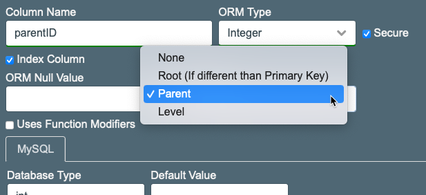 In the sample below, the properties "parent" and "level" are being used. The property "root" is not being used. The "root" property marks the non-primary-key column holding the branch's unique identifier.